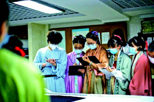 漢服商家、研究者們?cè)谥袊z綢博物館仔細(xì)記錄文物細(xì)節(jié)。(陳潤熙/攝)