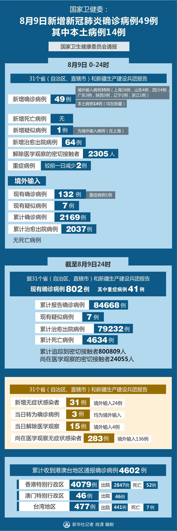 截至8月9日24時(shí),據(jù)31個(gè)?。ㄗ灾螀^(qū)、直轄市)和新疆生產(chǎn)建設(shè)兵團(tuán)報(bào)告,現(xiàn)有確診病例802例(其中重癥病例41例),累計(jì)治愈出院病例79232例,累計(jì)死亡病例4634例,累計(jì)報(bào)告確診病例84668例,現(xiàn)有疑似病例7例。累計(jì)追蹤到密切接觸者800809人,尚在醫(yī)學(xué)觀察的密切接觸者24055人。