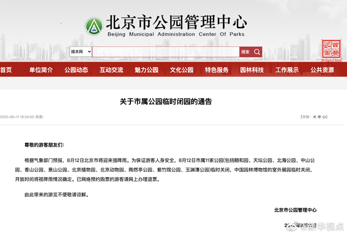北京市公園管理中心11日晚發(fā)布關(guān)于市屬公園臨時(shí)閉園的通告。通告稱,根據(jù)氣象部門(mén)預(yù)報(bào),8月12日北京市將迎來(lái)強(qiáng)降雨。為保證游客人身安全,8月12日市屬11家公園(包括頤和園、天壇公園、北海公園、中山公園、香山公園、景山公園、北京植物園、北京動(dòng)物園、陶然亭公園、紫竹院公園、玉淵潭公園)臨時(shí)關(guān)閉,中國(guó)園林博物館的室外展園臨時(shí)關(guān)閉,開(kāi)放時(shí)間將視降雨情況確定。已網(wǎng)絡(luò)預(yù)約購(gòu)票的游客請(qǐng)網(wǎng)上辦理退票。(記者魏夢(mèng)佳)?