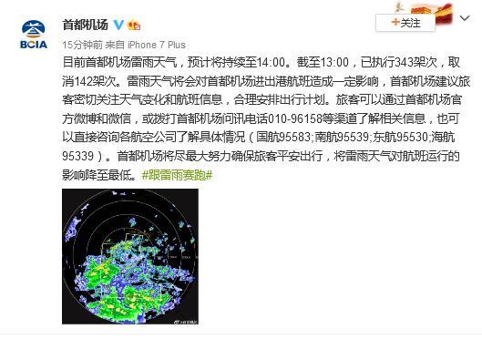 據(jù)北京首都國際機(jī)場官方微博消息,目前首都機(jī)場雷雨天氣,預(yù)計將持續(xù)至14時。截至13時,已執(zhí)行343架次,取消142架次。雷雨天氣將會對首都機(jī)場進(jìn)出港航班造成一定影響,首都機(jī)場建議旅客密切關(guān)注天氣變化和航班信息,合理安排出行計劃。