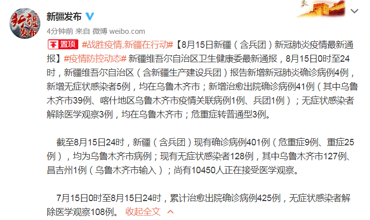 新疆維吾爾自治區(qū)衛(wèi)生健康委最新通報(bào),8月15日0時(shí)至24時(shí),新疆維吾爾自治區(qū)(含新疆生產(chǎn)建設(shè)兵團(tuán))報(bào)告新增新冠肺炎確診病例4例,新增無(wú)癥狀感染者5例,均在烏魯木齊市;新增治愈出院確診病例41例(其中烏魯木齊市39例、喀什地區(qū)烏魯木齊市疫情關(guān)聯(lián)病例1例、兵團(tuán)1例);無(wú)癥狀感染者解除醫(yī)學(xué)觀察3例,均在烏魯木齊市;危重癥轉(zhuǎn)普通型3例。