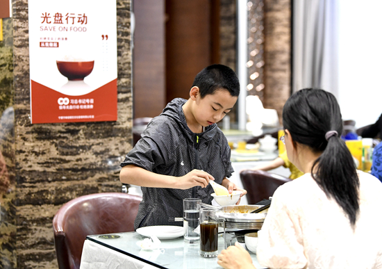 8月15日,記者走進(jìn)位于內(nèi)蒙古自治區(qū)呼和浩特市的一家粵菜餐廳,一進(jìn)門就看到倡導(dǎo)“光盤行動(dòng)”的海報(bào),每張餐桌旁也都張貼著“節(jié)約糧食”“使用公筷”的標(biāo)語。
