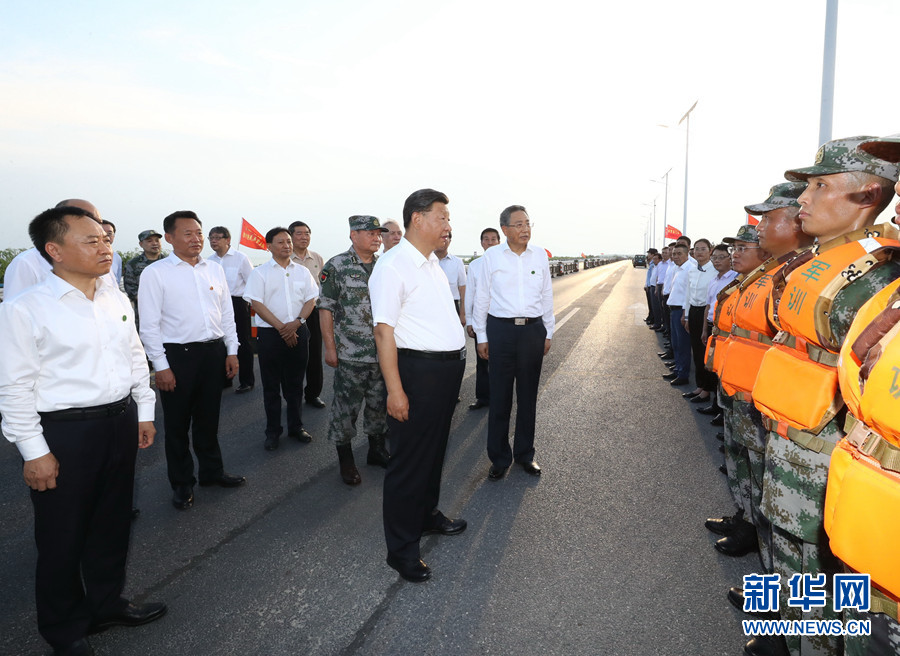 大堤上,習(xí)近平親切看望慰問了在防汛抗洪救災(zāi)斗爭中犧牲同志的家屬、防汛抗洪一線人員、先進典型代表和參加抗洪搶險的部隊官兵,并向全國奮戰(zhàn)在防汛抗洪救災(zāi)一線的同志們表示誠摯的問候。他強調(diào),今年入汛以來,南北方江河湖泊接連出現(xiàn)超警戒水位險情。廣大干部群眾和人民解放軍、武警官兵堅決響應(yīng)黨和政府號召,發(fā)揚不怕累苦、不怕疲勞、不怕犧牲的精神斗志,堅守在防汛抗洪救災(zāi)第一線,涌現(xiàn)了許多先進典型和感人事跡,展現(xiàn)了中國人民眾志成城、頑強拼搏、敢于勝利的英雄氣概,書寫了洪水無情人有情的人間大愛。黨和人民感謝你們!