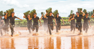 中隊(duì)官兵扛著彈藥箱在泥水中訓(xùn)練沖刺。記者 金 歆攝