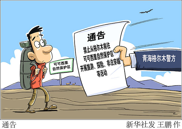 為加強(qiáng)可可西里自然保護(hù)區(qū)的管理和保護(hù),保障廣大人民群眾和游客人身安全,維護(hù)社會治安秩序,格爾木市公安局根據(jù)有關(guān)法律法規(guī)和文件精神發(fā)布通告,禁止一切社會團(tuán)體或個(gè)人隨意從格爾木前往玉樹藏族自治州可可西里自然保護(hù)區(qū),開展旅游、探險(xiǎn)、非法穿越等活動。