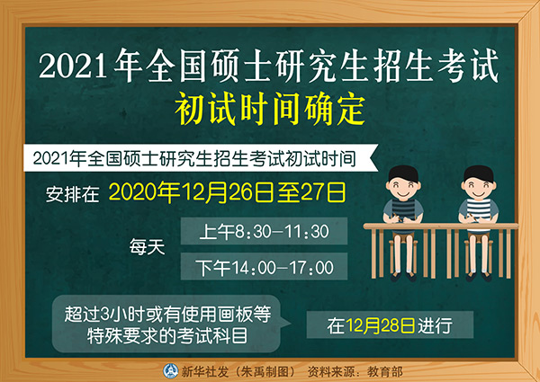 新華社北京9月4日電(記者胡浩)記者4日從教育部了解到,2021年全國(guó)碩士研究生招生考試初試時(shí)間安排在2020年12月26日至27日(每天上午8:30-11:30,下午14:00-17:00),超過3小時(shí)或有使用畫板等特殊要求的考試科目在12月28日進(jìn)行。