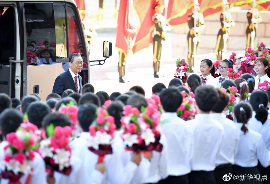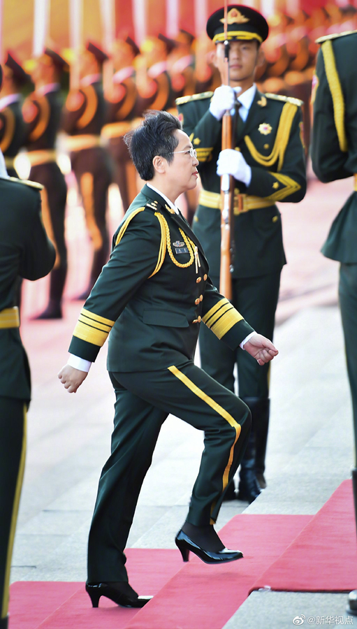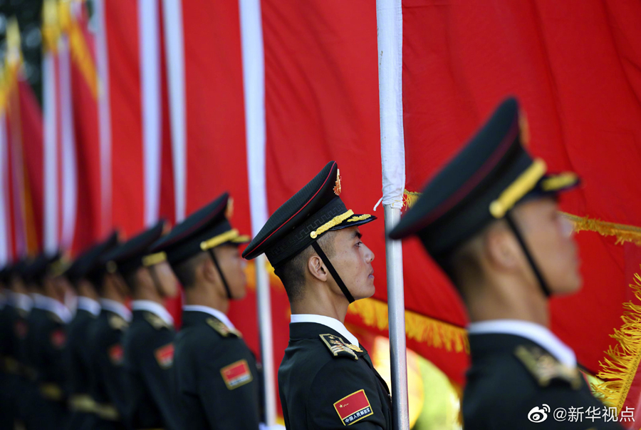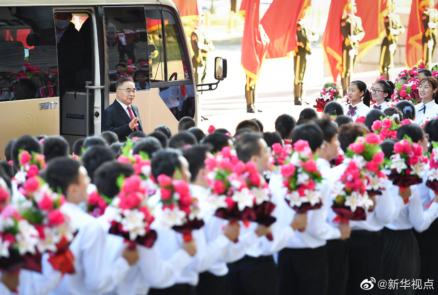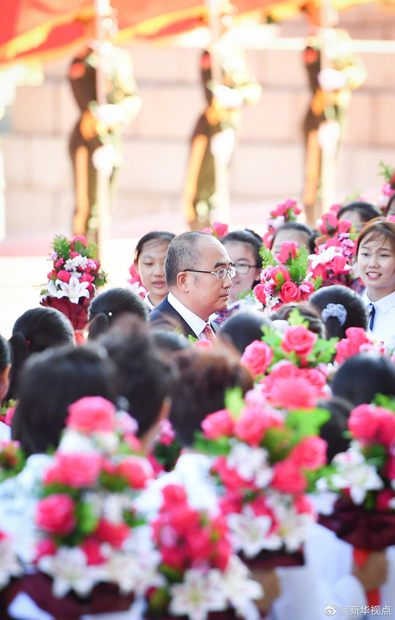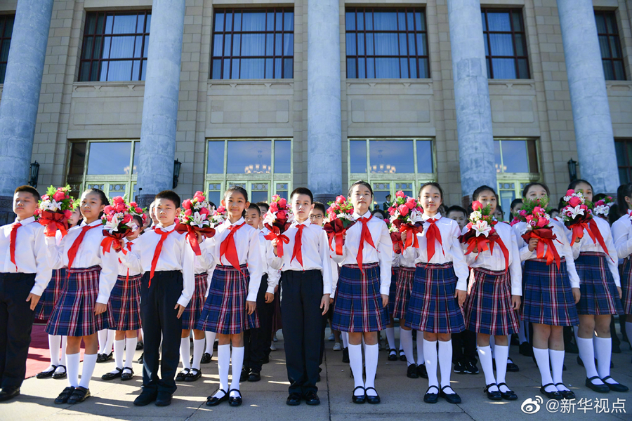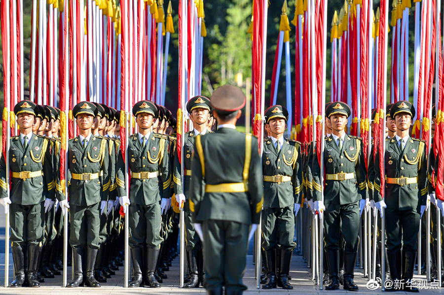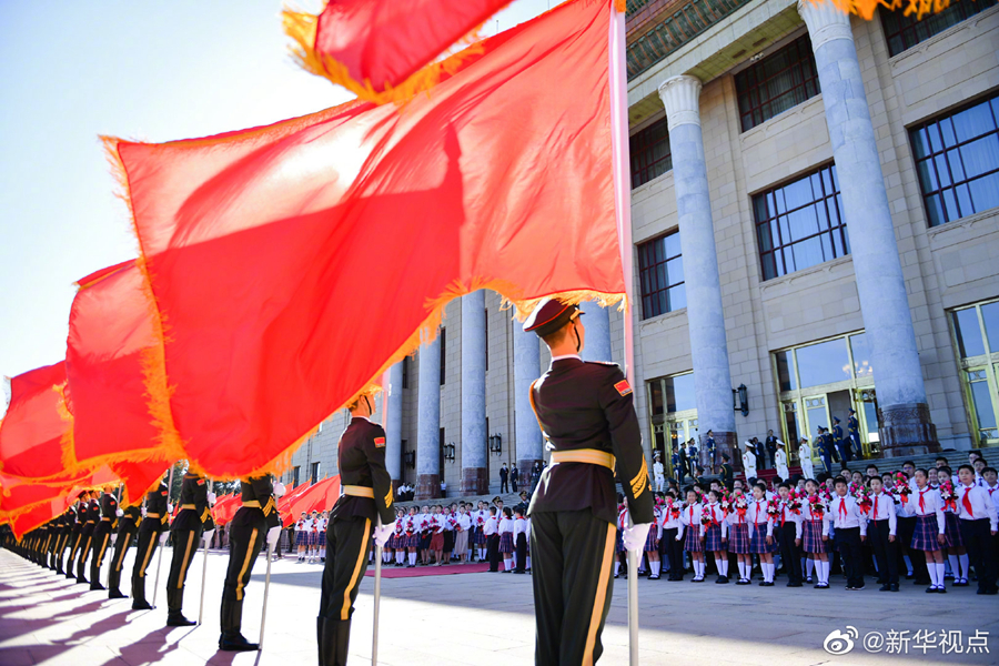 人民大會堂北門外,高擎紅旗的禮兵分列道路兩側(cè),肩槍禮兵在臺階上莊嚴(yán)佇立,青少年熱情歡呼致意。國家勛章和國家榮譽稱號獲得者沿著紅毯拾級而上,進(jìn)入人民大會堂。(攝影 龐興雷 劉彬 殷博古 李響)