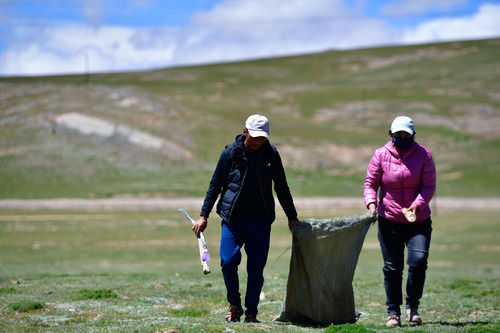 在青海省果洛藏族自治州瑪多縣瑪查理鎮(zhèn)噶丹村,生態(tài)管護員索南吉(右)與才讓多杰在村子周邊的草原上撿垃圾(8月19日攝)。新華社記者 張龍 攝