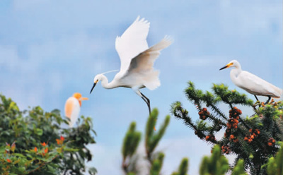 湖南省邵陽市洞口縣羅溪瑤族鄉(xiāng)鐵山村,成群的鷺鳥在飛舞歡歌。滕治中攝(人民視覺)