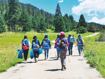 志愿者在魯朗出發(fā)準(zhǔn)備撿垃圾。宋衛(wèi)華攝