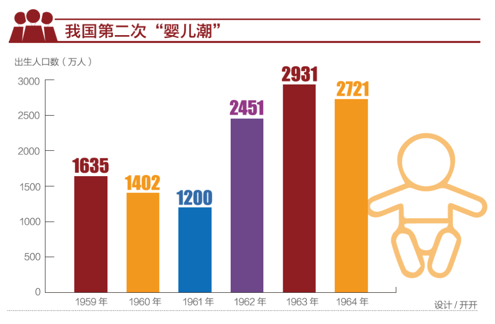大家都知道,上世紀(jì)三年自然災(zāi)害結(jié)束后,我國迎來了第二次“嬰兒潮”。三年自然災(zāi)害的第一年、1959年我國出生人口是1635萬,1960年是1402萬,1961年下降到最低,是1200萬。緊接著就是“嬰兒潮”,1962年是2451萬,1963年達(dá)到峰值2931萬,1964年是2721萬。