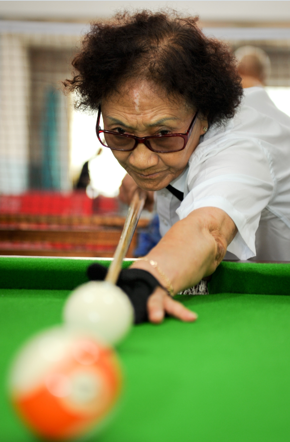 長春市春城街道活動中心老人馮化庚在該中心臺球培訓(xùn)班做示范