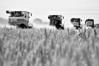 在山東省汶上縣郭倉(cāng)鎮(zhèn),收割機(jī)在收獲小麥。新華社發(fā)