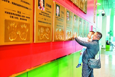 上下圖均為觀眾在中國(guó)科技館參觀“國(guó)家最高科學(xué)技術(shù)獎(jiǎng)獲獎(jiǎng)科學(xué)家手模墻”。中國(guó)科技館供圖