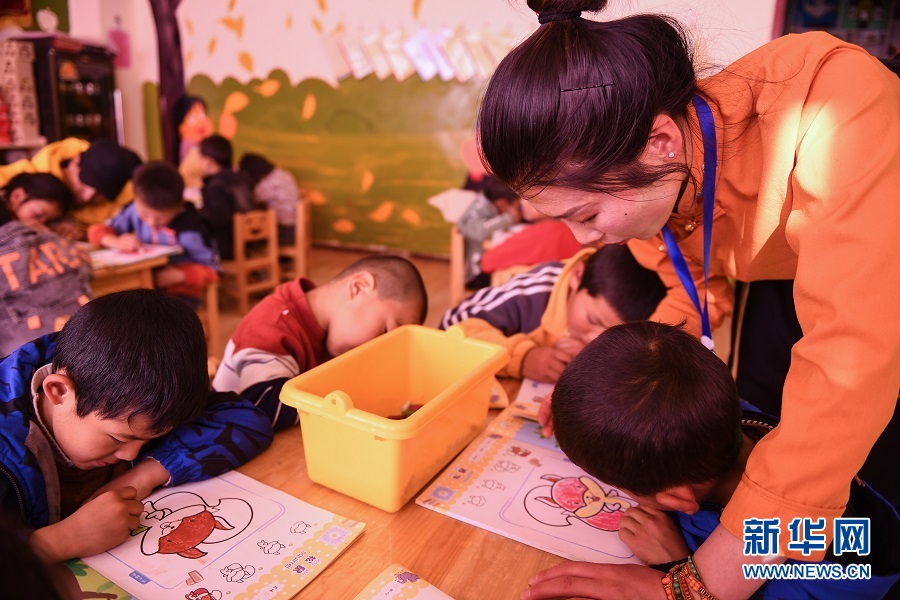 9月17日,青海省果洛藏族自治州瑪沁縣拉加鎮(zhèn)中心幼兒園的老師輔導孩子們上美術課。(新華網(wǎng)潘彬彬 攝)
