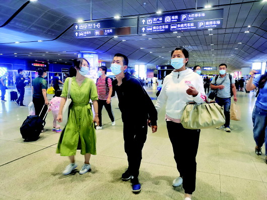 王唯佳(中)到達(dá)天津火車站,在輔導(dǎo)員高雨桐(左)和家人陪伴下走向南開大學(xué)校車。本報(bào)記者白佳麗攝