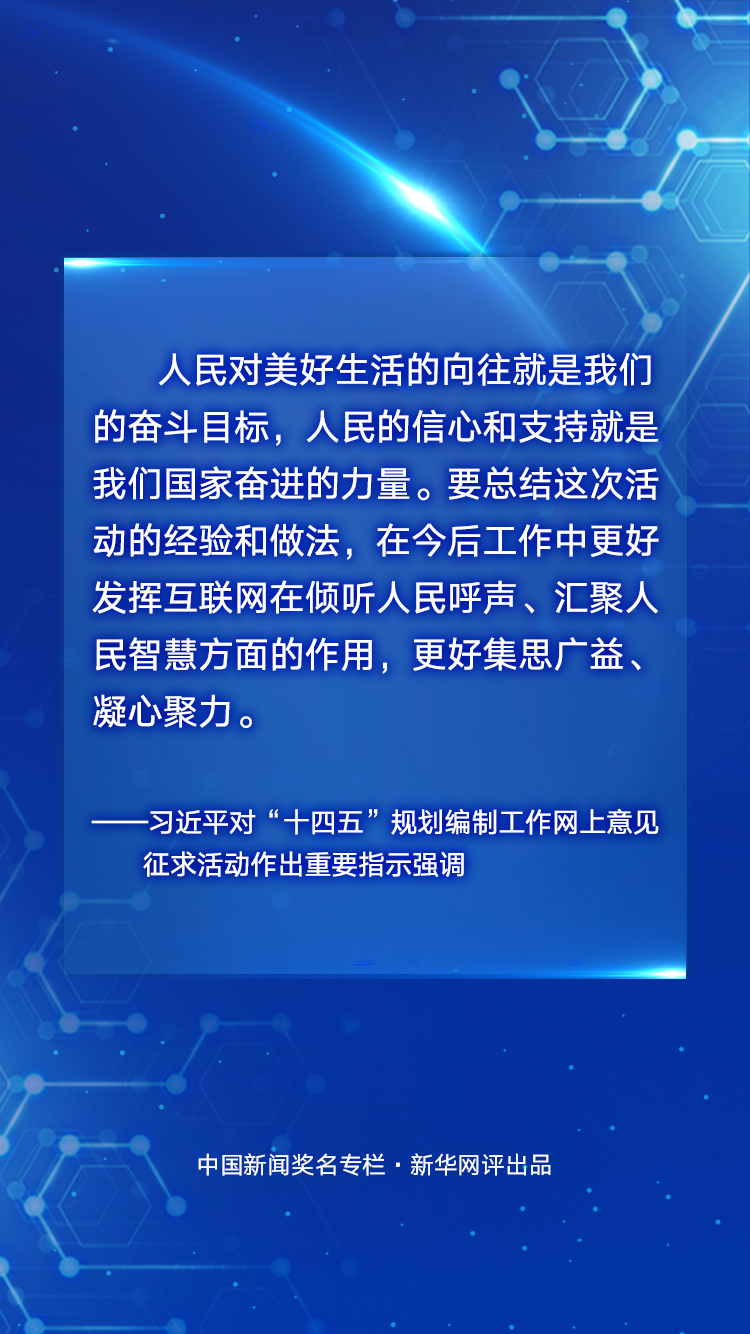 今年8月16日至29日,“十四五”規(guī)劃編制工作開展網(wǎng)上意見征求活動?;顒咏M織有序,社會反響熱烈,累計收到網(wǎng)民建言超過101.8萬條,為做好“十四五”規(guī)劃編制工作提供了有益參考。廣大人民群眾提出的意見和建議廣泛而具體,充分表達(dá)了對美好生活的新期盼。這正是網(wǎng)聚民意、廣開言路,走網(wǎng)絡(luò)群眾路線的表現(xiàn)。