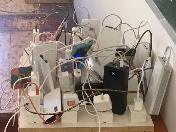 每間教室的講臺(tái)旁邊都放著一排插線板,上面插滿了充電寶。據(jù)學(xué)生介紹,學(xué)校封禁了宿舍內(nèi)的插電孔,他們只能將充電寶在教室充滿電后帶回宿舍用?!坝袝r(shí)候教室里充電的地方滿了,要么排隊(duì),要么去超市花錢充?!庇捎谒奚釠]插電孔、沒網(wǎng),這里的大學(xué)生幾乎沒人用電腦。小許說,學(xué)校說宿舍不能充電是為了防火安全,但是如此管理未免太過“簡(jiǎn)單粗暴”。