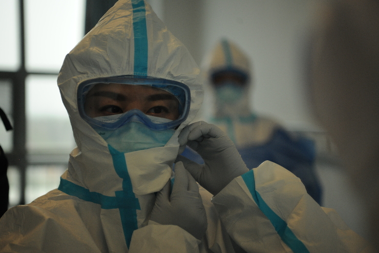 在華中科技大學(xué)同濟醫(yī)院光谷院區(qū)采訪,進(jìn)重癥ICU前做好防護準(zhǔn)備