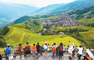 觀賞梯田秋色,體驗民俗風情,廣西桂林市龍勝各族自治縣龍脊梯田景區(qū)旅游持續(xù)火爆。圖為10月3日,游客在景區(qū)觀光游覽。吳生斌攝(影像中國)