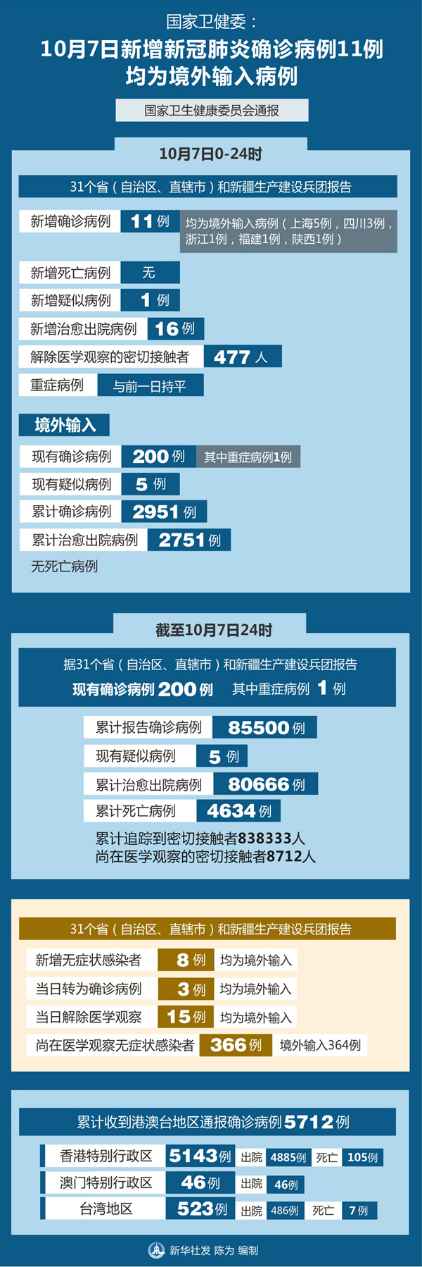 新華社北京10月8日電 國家衛(wèi)健委8日通報,10月7日0-24時,31個?。ㄗ灾螀^(qū)、直轄市)和新疆生產(chǎn)建設(shè)兵團報告新增新冠肺炎確診病例11例,均為境外輸入病例(上海5例,四川3例,浙江1例,福建1例,陜西1例);無新增死亡病例;新增疑似病例1例,為境外輸入病例(在上海)。