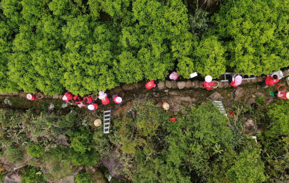 廣東省潮州市潮安區(qū)鳳凰鎮(zhèn)山上,采茶工在采茶。無(wú)人機(jī)照片 新華社記者 鄧華 攝