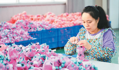 近年來,陜西省安康市漢濱區(qū)緊抓蘇陜扶貧協(xié)作機遇,積極利用協(xié)作項目推動當(dāng)?shù)亟?jīng)濟和社會事業(yè)發(fā)展。圖為工人在漢濱區(qū)五里工業(yè)集中區(qū)一家毛絨玩具公司的車間內(nèi)工作,該工業(yè)集中區(qū)由蘇陜協(xié)作資金幫助建設(shè)。新華社記者 邵 瑞攝
