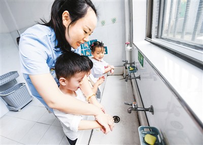 9月24日,浙江省湖州市吳興區(qū)織里鎮(zhèn)衛(wèi)生院的醫(yī)護人員教織北幼兒園的孩子們正確的洗手步驟。新華社記者 徐 昱攝