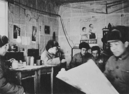 朝鮮戰(zhàn)場的環(huán)境十分艱苦,志愿軍總分社的編輯部常年設(shè)在陰暗潮濕的山洞里,駐地附近幾次遭到敵機(jī)轟炸、掃射。圖為總分社何友、李健華、孫大文等同志在山洞內(nèi)學(xué)習(xí)。