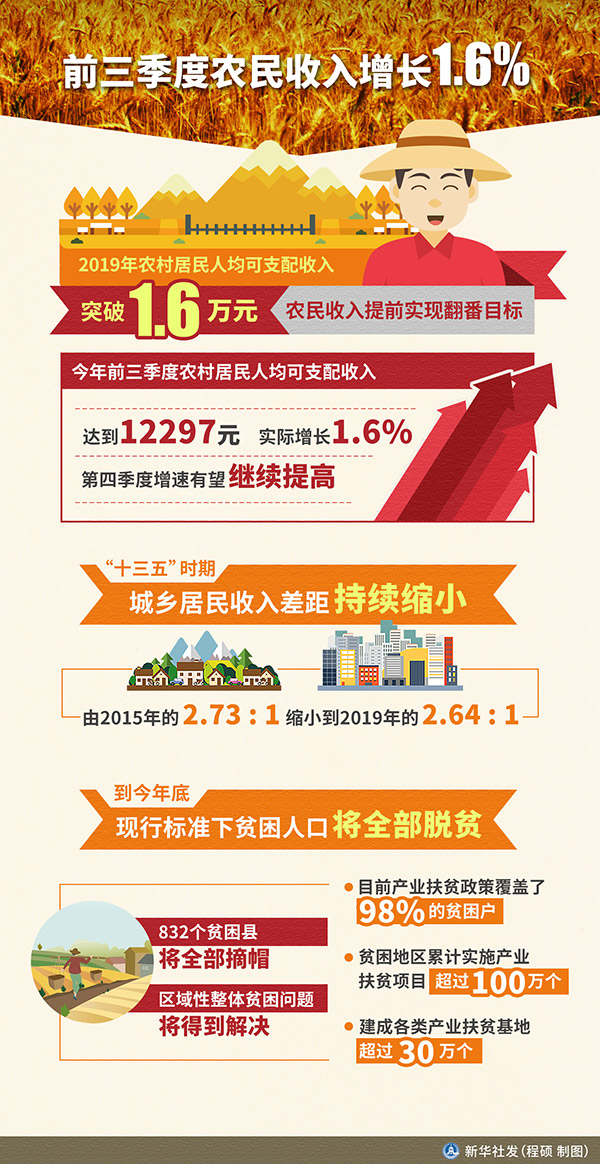 新華社北京10月27日電(記者于文靜)農(nóng)業(yè)農(nóng)村部副部長劉煥鑫27日表示,2019年農(nóng)村居民人均可支配收入突破1.6萬元,農(nóng)民收入提前實現(xiàn)翻番目標(biāo)。今年前三季度農(nóng)村居民人均可支配收入達到12297元,實際增長1.6%,第四季度增速有望繼續(xù)提高,小康之年農(nóng)民將有更多獲得感。
