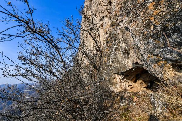 這次路程明顯縮短,但卻十分陡峭。有的路段,我們只能側(cè)著身子,石階僅容一只腳,兩只手只能扒著峭壁,而身后就是懸崖,有時需要雙腿跪著,慢慢挪動身體。由于沒吃、沒喝,嘴唇干裂起皮,開口說話也有點吃力。這樣攀爬一個多小時后,一個山洞進(jìn)入我們的視野。