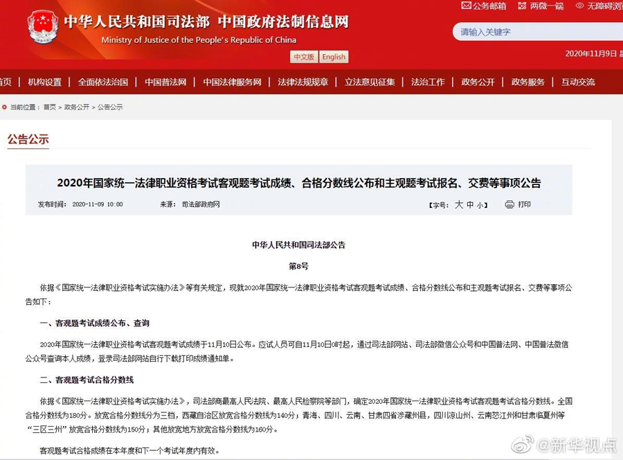 記者9日從司法部獲悉,2020年國家統(tǒng)一法律職業(yè)資格考試客觀題考試成績將于11月10日公布,全國合格分數(shù)線為180分。自11月10日0時起,應試人員可通過司法部網站、司法部微信公眾號和中國普法網、中國普法微信公眾號查詢成績,登錄司法部網站自行下載打印成績通知單。通過2020年客觀題考試的應試人員和2019年客觀題考試保留有效成績人員,應于11月10日0時至11月14日24時,登錄司法部網站報名確認參加主觀題考試。(記者白陽)