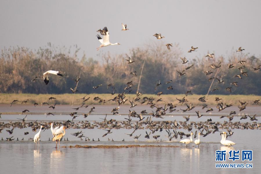 這是在鄱陽(yáng)湖濕地地區(qū)江西省南昌市高新區(qū)鯉魚洲管理處周邊水域拍攝的越冬候鳥(11月5日攝)。新華社記者 彭昭之 攝
