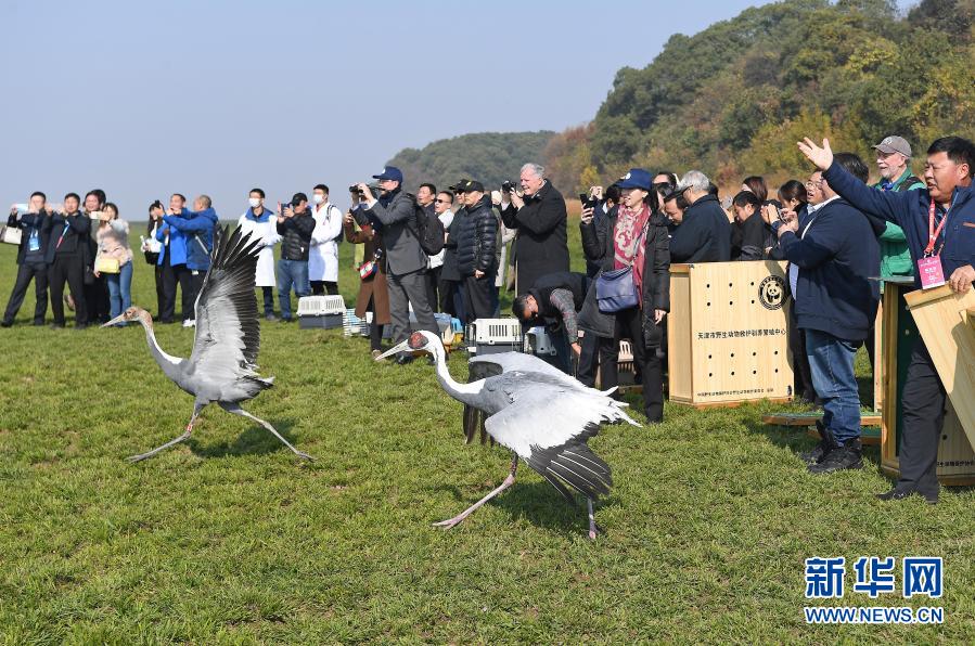 2019年12月8日,國(guó)內(nèi)多家野生動(dòng)物保護(hù)機(jī)構(gòu)在江西鄱陽(yáng)湖國(guó)家級(jí)自然保護(hù)區(qū)將120只被救治的珍稀候鳥成功放飛。這是工作人員放飛兩只白枕鶴。新華社記者 萬象 攝