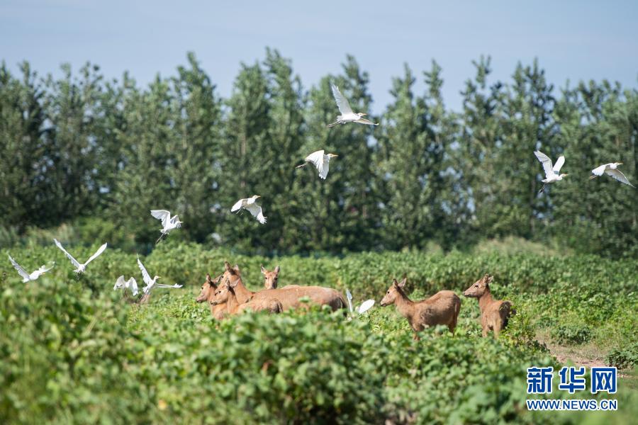 在位于湖南岳陽(yáng)市的東洞庭湖麋鹿和鳥類救治避難中心拍攝的麋鹿和飛鳥(8月7日攝)。新華社記者 陳思汗 攝