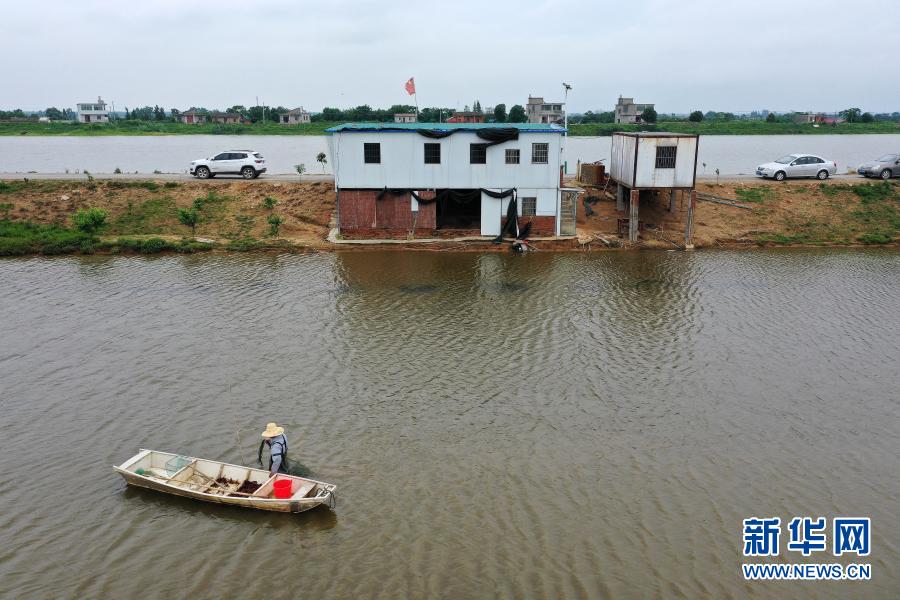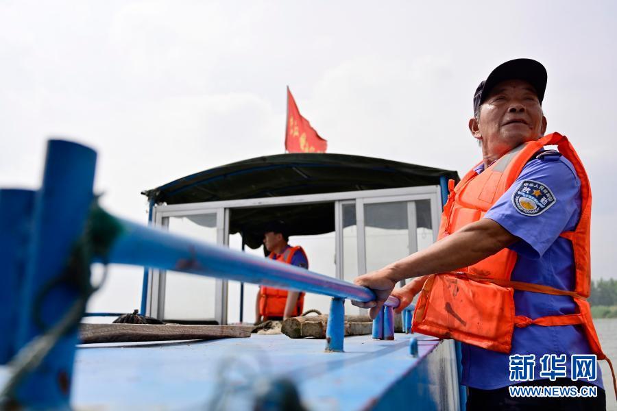 在江西省湖口縣,江豚協(xié)助巡護(hù)隊(duì)的隊(duì)員伍后春在觀察水面是否有違法捕撈的工具。他和他的父親、爺爺三代在鄱陽(yáng)湖和長(zhǎng)江捕魚為生,2017年開始上岸,目前已成為巡護(hù)隊(duì)隊(duì)員(6月8日攝)。新華社記者 彭昭之 攝