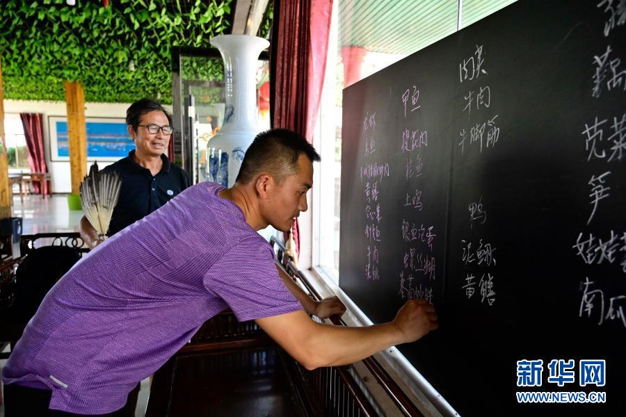 在江西省余干縣田園鄱陽(yáng)湖景區(qū),上岸漁民朱義才(后)在自己開辦的農(nóng)家樂內(nèi)和兒子一起寫當(dāng)日的菜譜(6月16日攝)。新華社記者 彭昭之 攝