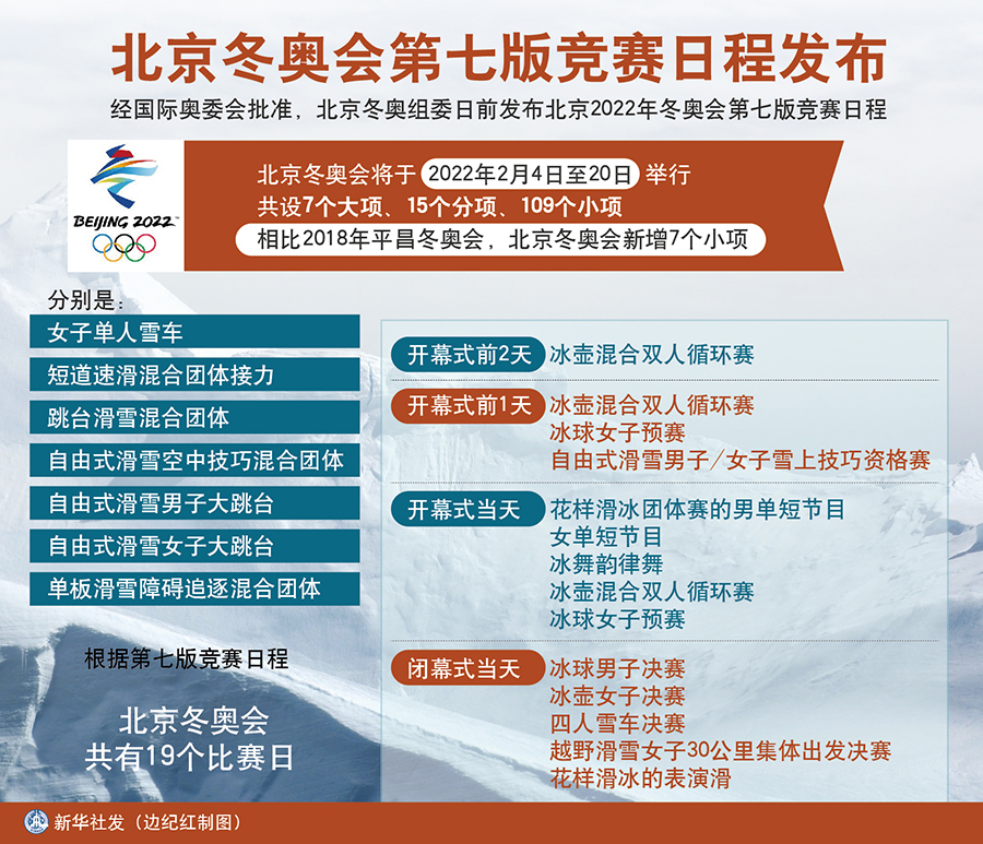 根據(jù)第七版競賽日程,北京冬奧會共有19個比賽日。最早的比賽是開幕式前2天進行的冰壺混合雙人循環(huán)賽;開幕式前1天將舉行冰壺混合雙人循環(huán)賽、冰球女子預(yù)賽和自由式滑雪男子/女子雪上技巧資格賽;開幕式當天將舉行花樣滑冰團體賽的男單短節(jié)目、女單短節(jié)目和冰舞韻律舞,冰壺混合雙人循環(huán)賽和冰球女子預(yù)賽;閉幕式當天將舉行冰球男子決賽、冰壺女子決賽、四人雪車決賽、越野滑雪女子30公里集體出發(fā)決賽以及花樣滑冰的表演滑。