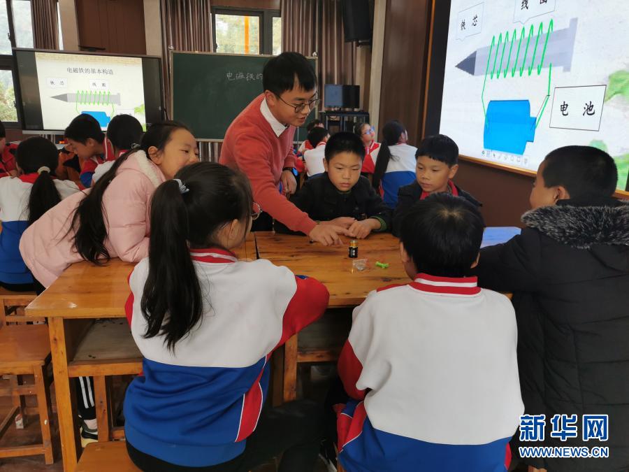 在重慶市石柱土家族自治縣中益鄉(xiāng)小學(xué),唐大鵬(中)給孩子們上科學(xué)課(10月20日攝)。新華社發(fā)(劉婷 攝)