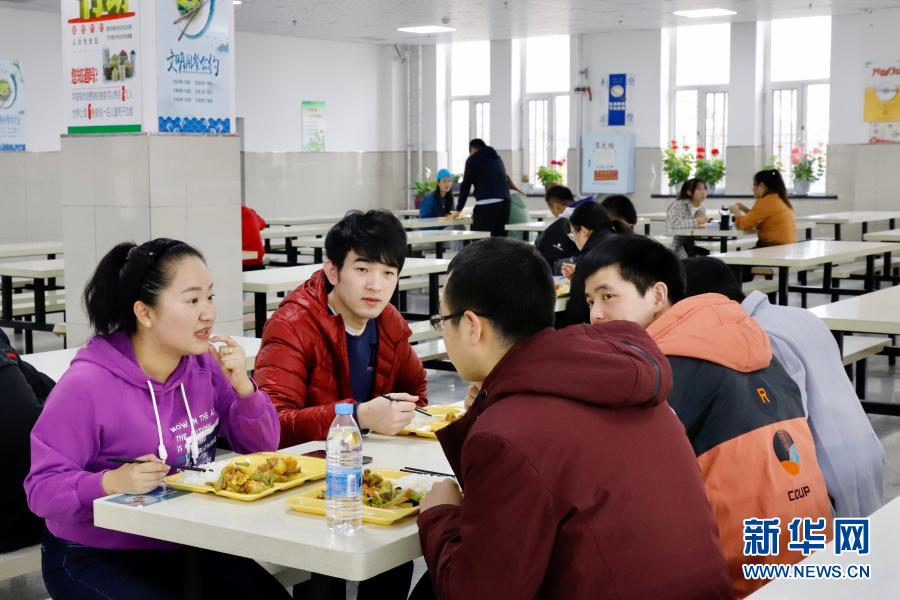 11月18日,在黑龍江綏化學(xué)院,李澤卉(左一)與學(xué)生一起吃飯。新華社發(fā)(黃龍斌 攝)