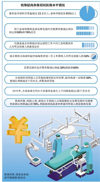 城鄉(xiāng)居民大病保險起付線降低并統(tǒng)一至上年居民人均可支配收入的50%,政策范圍內醫(yī)療費用報銷比例由50%提高到60%。同時,大病保險對貧困人口實施精準傾斜支付政策,起付線進一步降低50%,報銷比例提高5個百分點,并取消封頂線。2019年,大病患者支付水平在基本醫(yī)保之上平均提高超過13個百分點。