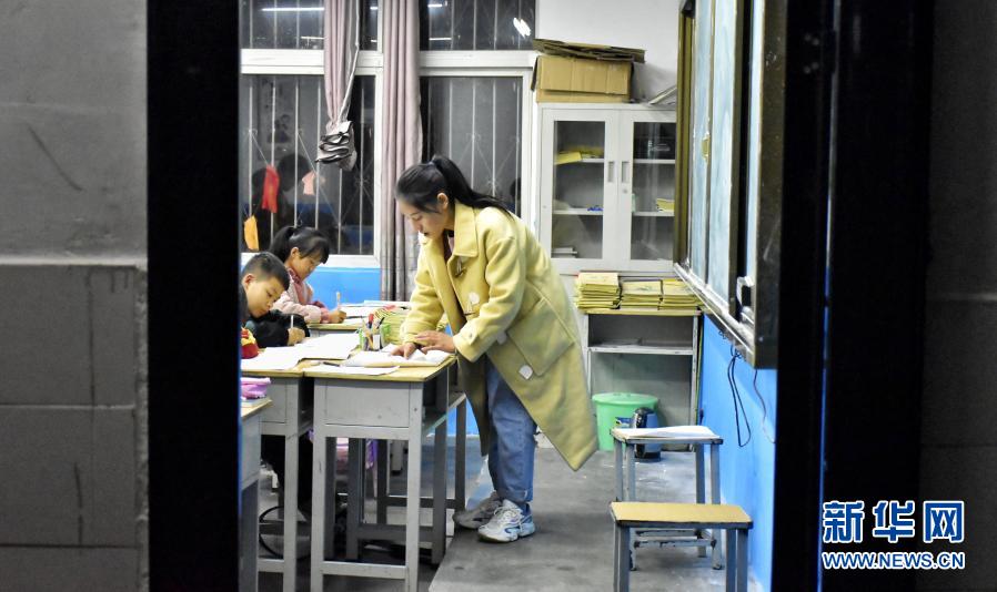 11月17日晚,在河南省洛陽市嵩縣德亭鎮(zhèn)酒店小學,王予川檢查學生作業(yè)。新華社記者 韓朝陽 攝