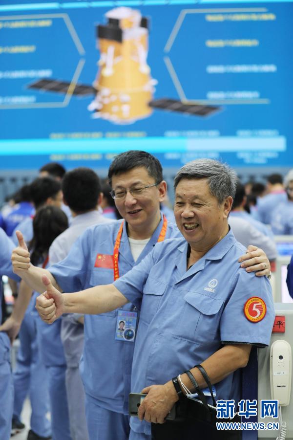 這是航天科技人員在文昌航天發(fā)射場慶祝發(fā)射成功。新華社記者金立旺攝