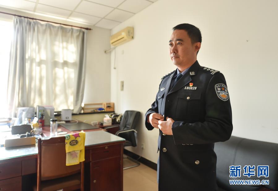 在天津市公安局物證鑒定中心,天津市公安局刑偵總隊十三支隊九大隊大隊長張忻鑫在辦公室整理著裝(11月25日攝)。新華社發(fā)(孫凡越 攝)