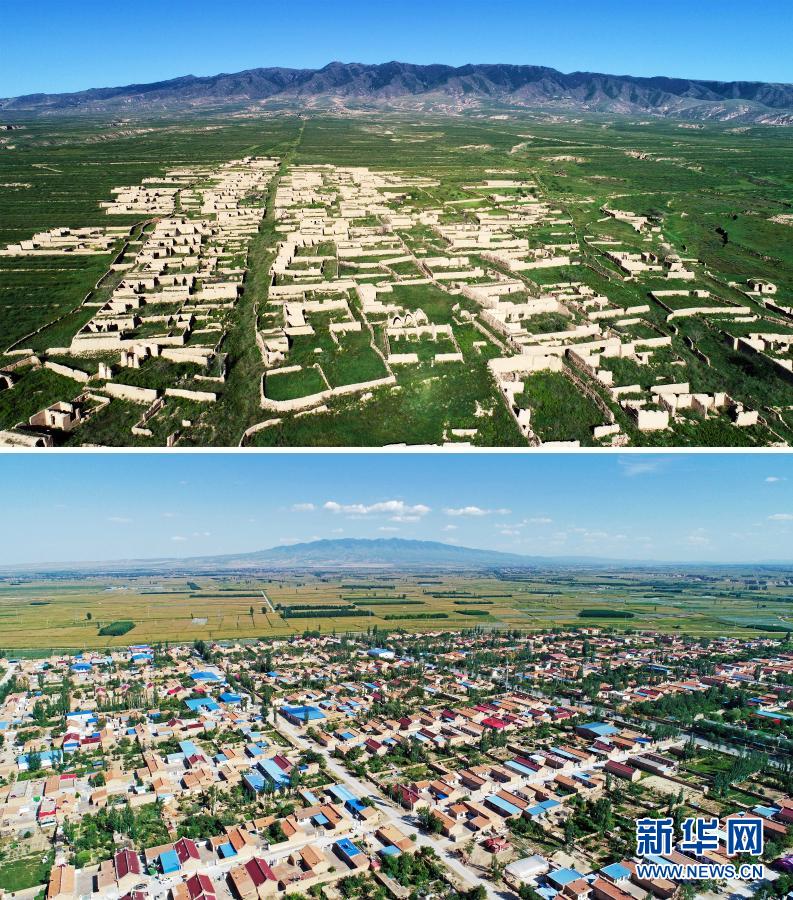 這是一張拼版照片,上圖為:經(jīng)過多年的生態(tài)修復(fù),寧夏吳忠市紅寺堡區(qū)新莊集鄉(xiāng)的移民舊址已逐漸被綠色覆蓋;下圖為:戈壁荒灘上建起的紅寺堡移民新村(2018年9月8日攝,無(wú)人機(jī)照片)。新華社記者 王鵬 攝
