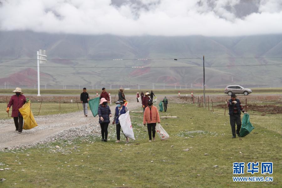 三江源國(guó)家公園治多生態(tài)環(huán)保協(xié)會(huì)的志愿者在撿拾垃圾(6月15日攝)。新華社發(fā)