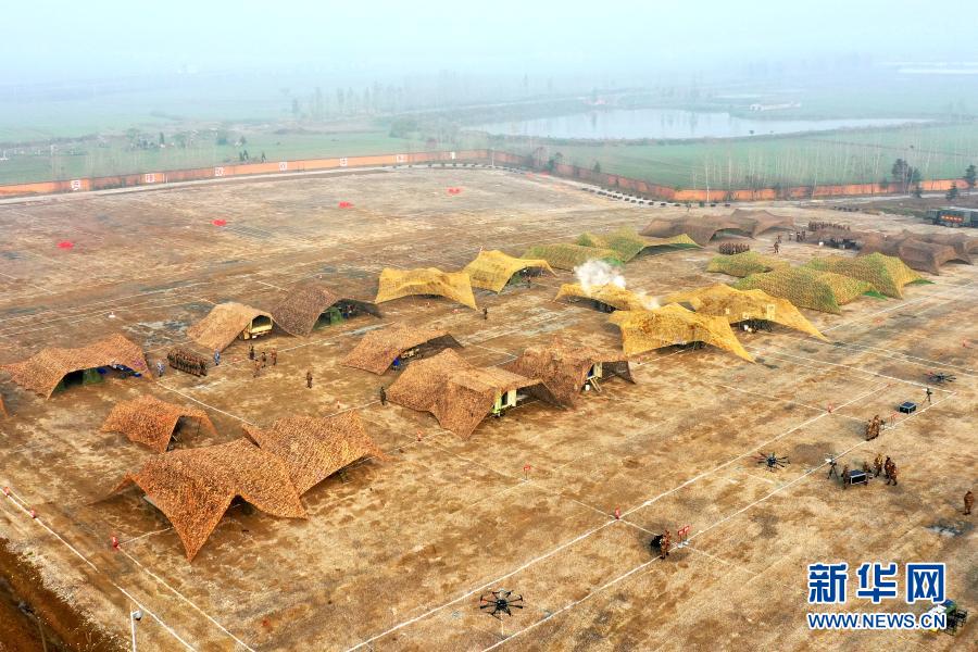飲食保障隊參賽隊員在偽裝網(wǎng)下的炊事車內(nèi)加工野戰(zhàn)快餐,并利用無人機前送(11月29日攝,無人機照片)。新華社發(fā)(姜梓涵 攝)