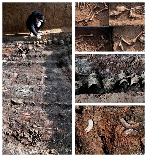 左圖為工作人員在清理河南洛陽徐陽墓地標號為M15的墓葬;右上圖為河南洛陽徐陽墓地標號為M15的墓葬周邊祭祀遺存內(nèi)出土的動物遺?。挥抑袌D為河南洛陽徐陽墓地標號為M15的墓葬出土的編鐘;右下圖為河南洛陽徐陽墓地標號為M15的墓葬出土的玉璜