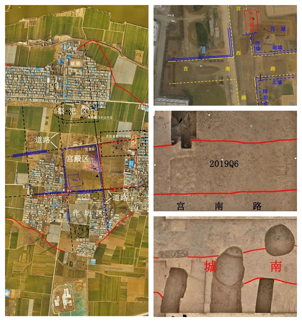 左圖為二里頭都城中心區(qū)的多網(wǎng)格式布局示意;右上圖為二里頭都城遺址中心區(qū)西南路口示意圖;右中圖為二里頭都城遺址宮西一區(qū)南墻垣平面;右下圖為二里頭都城遺址宮城南墻西段平面