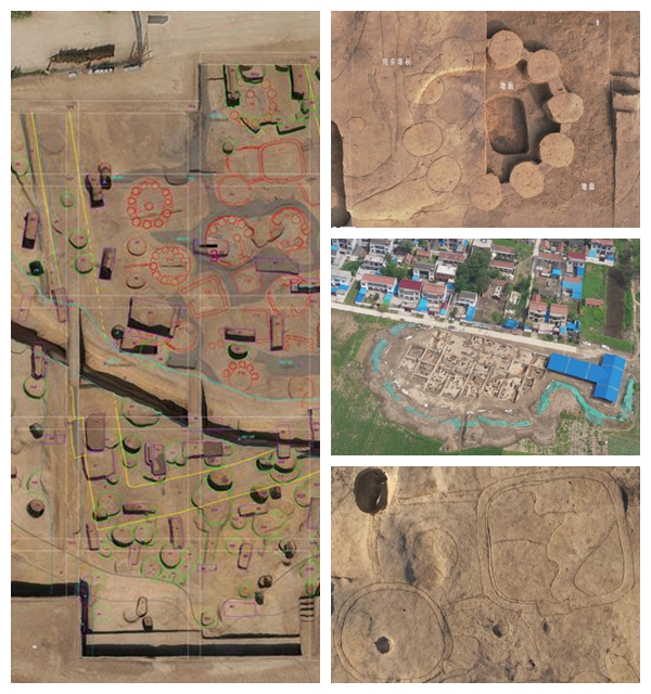 左圖為河南時莊遺址遺跡分布圖;右上圖為時莊遺址地上糧倉俯拍圖;右中圖為河南淮陽時莊遺址全景(無人機照片);右下圖為時莊遺址發(fā)現(xiàn)的圓形及圓角方形倉儲遺跡(上為北)